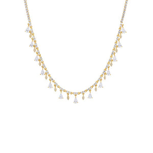 A tennis necklace is a distinctive style characterized by a continuous line of closely set diamonds or gemstones that are usually round and mounted on a flexible band. Unlike a regular necklace, which may feature a pendant or larger, more spaced-out stones, a tennis necklace offers an elegant, uniform look that sits comfortably along the neckline. The tennis necklace design provides an all-around sparkling effect, making it a standout piece perfect for special occasions or everyday elegance.