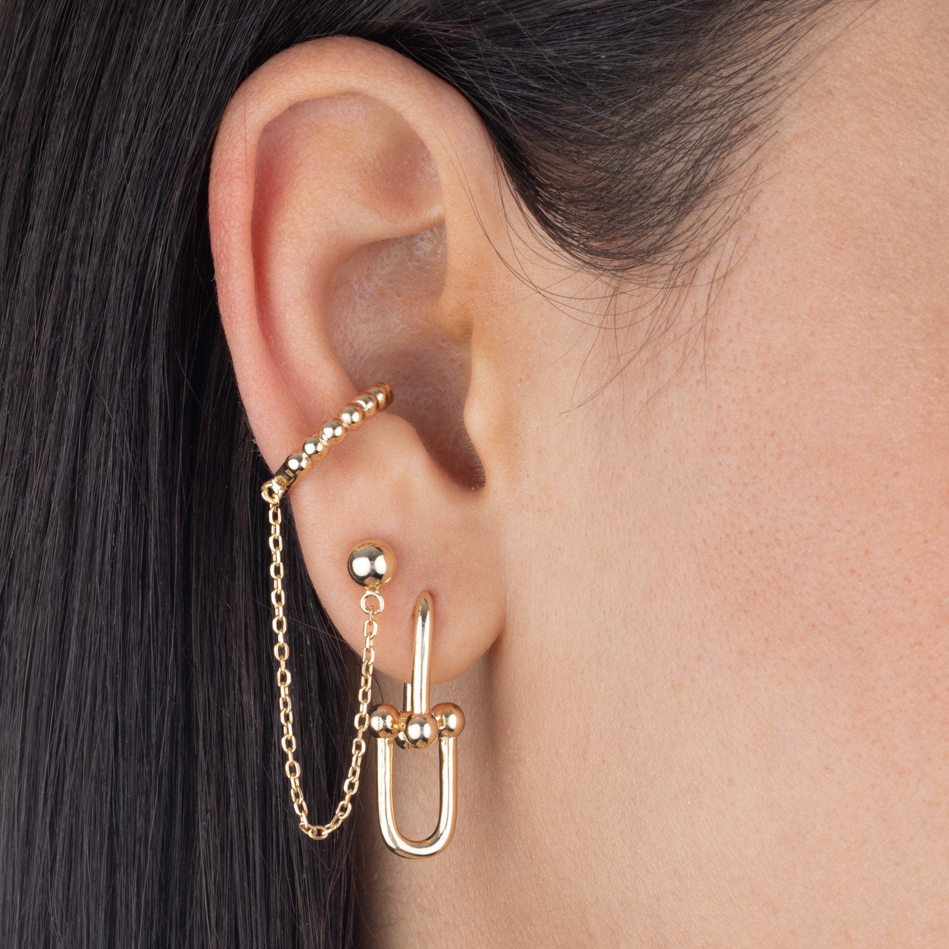 Amp up your elegant ear game with Adina Eden's Beaded Ear Cuff X Ball Stud Earring, featuring a glowing gold vermeil stud that is connected to a beaded ear cuff by a dainty chain. This stunner makes a great centerpiece for a chic stud stack, particularly when you flaunt it with a little black dress for a sophisticated yet edgy look.