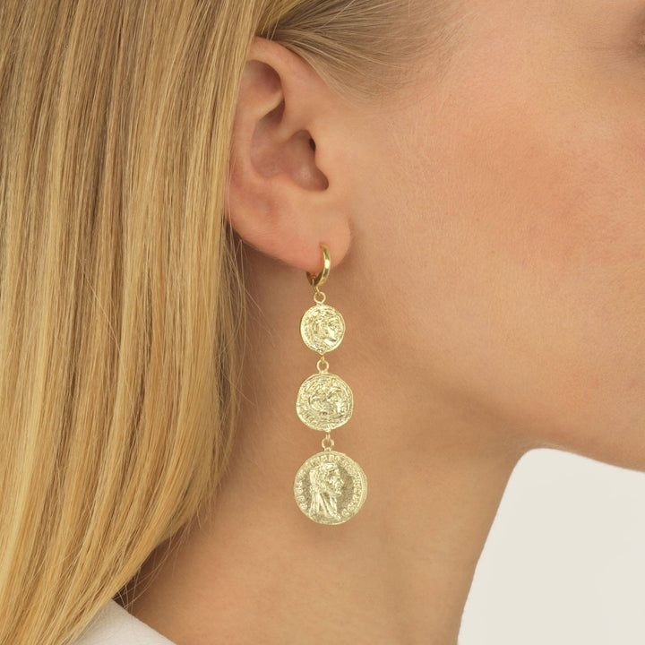 Crafted with three vintage-inspired coin pendants, Adina Eden's 'Caesar Coin' huggie earrings will make a unique statement. Rock them with a long dress for an effortlessly stylish look.
