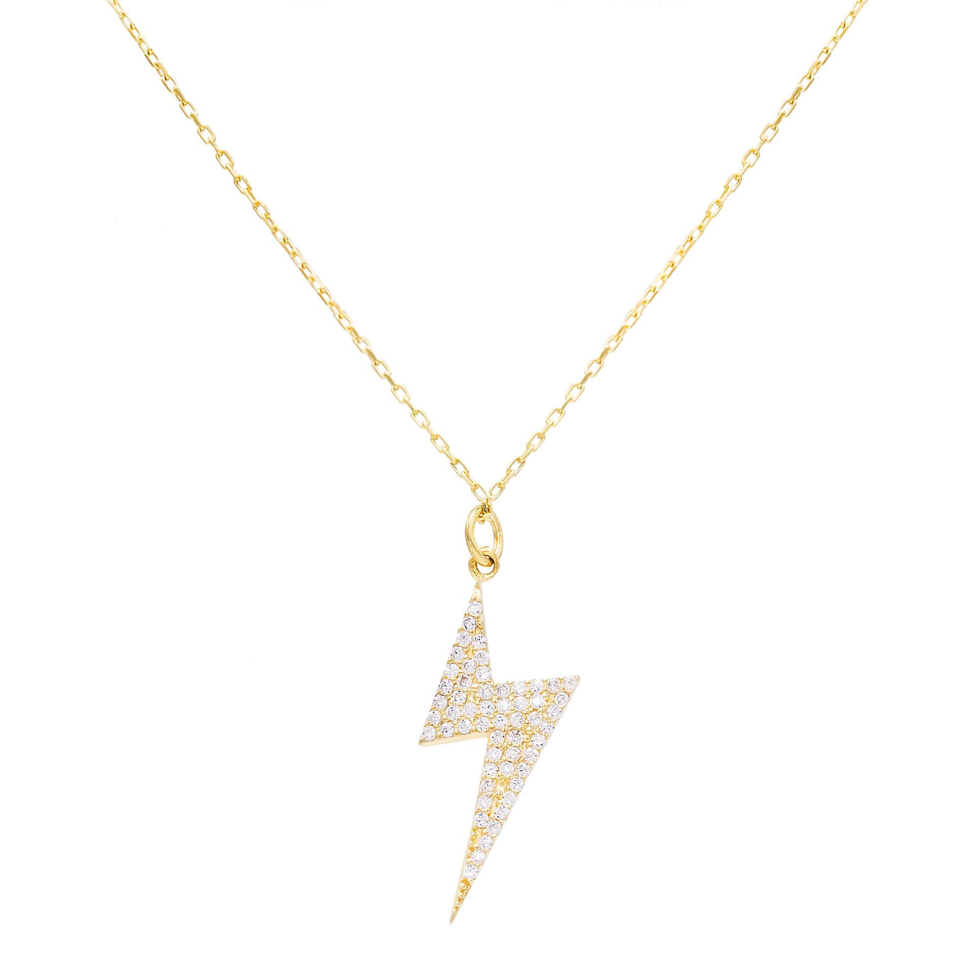 Make a shimmering statement in Adina Eden's 'CZ bolt' necklace, crafted with a large lightning bolt pendant set with shiny pavé stones. Rock this unique necklace with a nice dress for a glam nighttime look.
