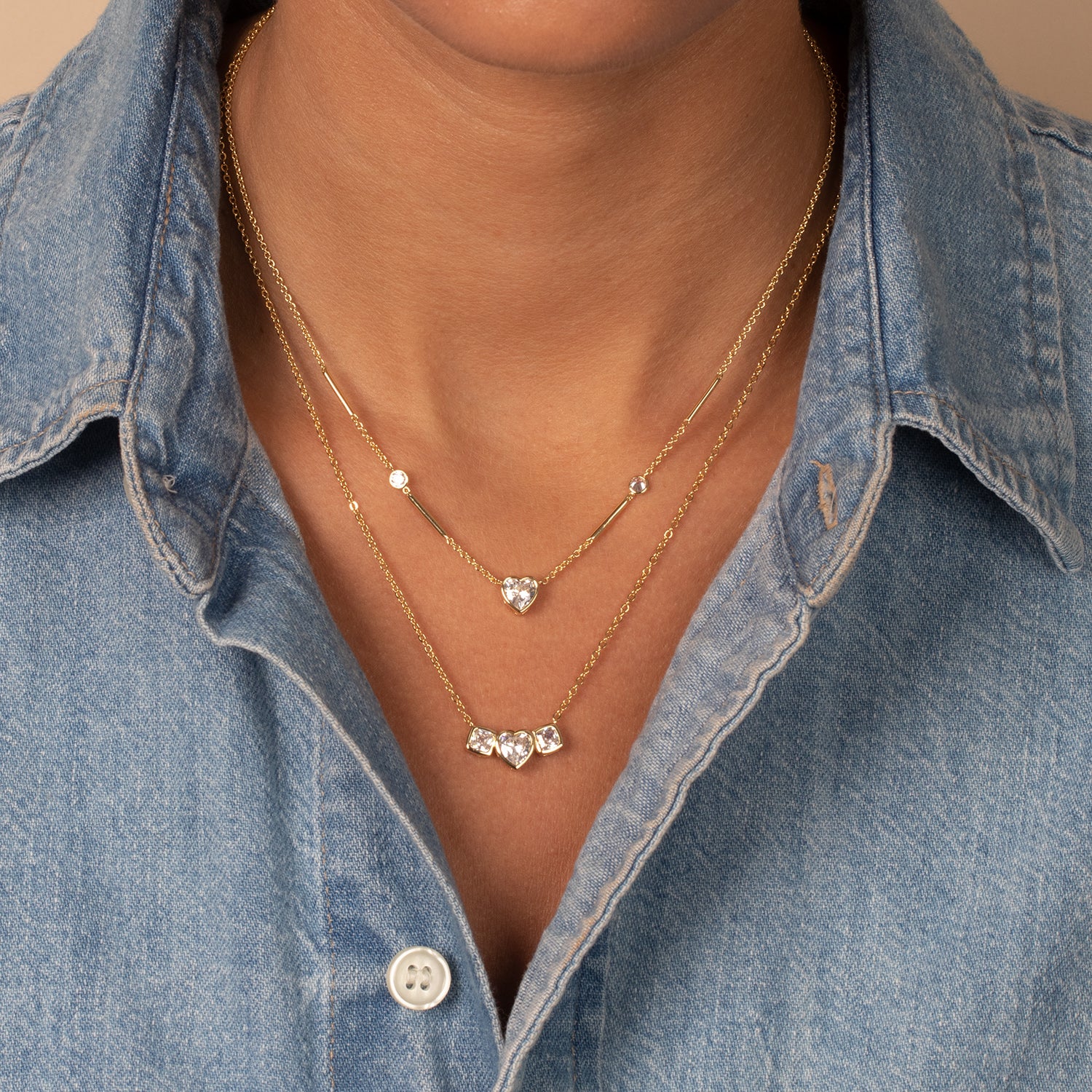 The Adina Eden CZ Heart Bezel X Bar Necklace is a charming and elegant piece, crafted from durable brass and plated in 14K gold. This necklace features a 7mm heart-shaped clear CZ stone set in a sleek bezel, paired with a modern bar design that adds sophistication and sparkle. With a length of 16" plus a 2" extender, it offers a customizable fit, making it perfect for layering or wearing alone as a minimalist statement piece. This necklace combines classic romance with contemporary design, making it a beautiful and versatile addition to any jewelry collection.