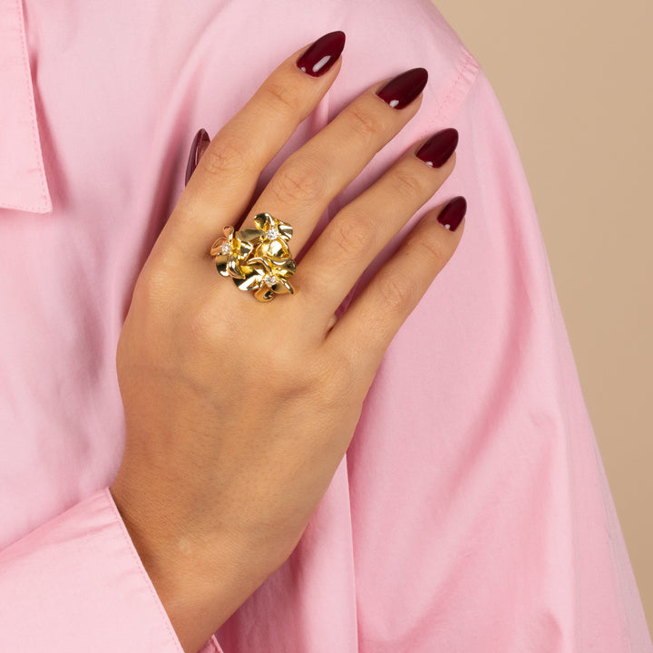 Introducing the CZ Multi Flower Fancy Ring, a stunning piece that adds a touch of floral elegance to your jewelry collection. Crafted from high-quality brass and plated with 14K gold, this ring features an intricate design of multiple flowers adorned with sparkling clear CZ stones. The flower centerpiece measures 27MM, making it a bold and eye-catching accessory. Available in ring size 7, this ring offers a comfortable fit and is perfect for special occasions or to elevate your everyday style. Embrace the beauty and sophistication of this exquisite multi-flower fancy ring and make a statement wherever you go.