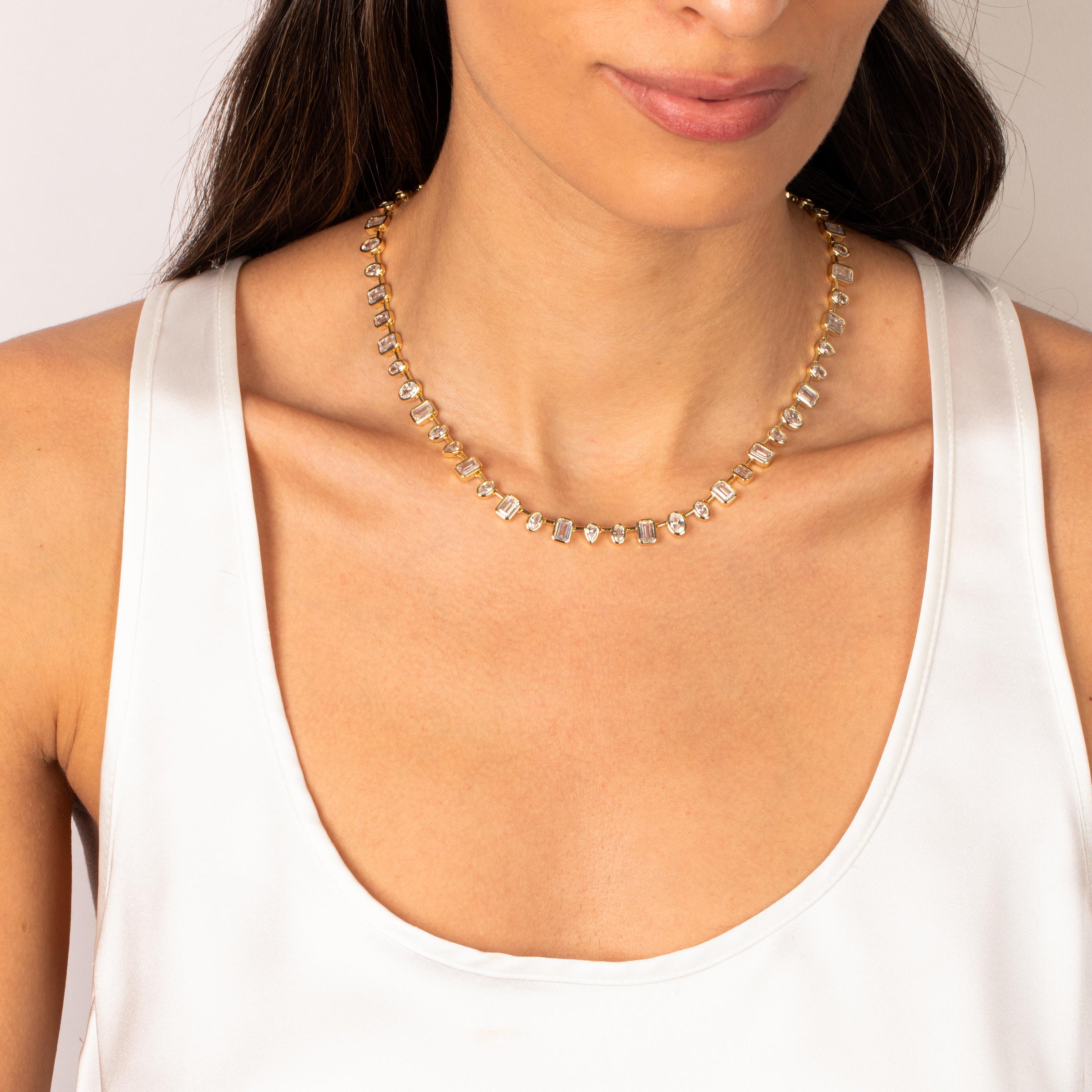The CZ Multi Shape Tennis Necklace by Adina Eden brings simple elegance to your jewelry rotation with this standout Necklace. Featuring soft edges and bold colorways, this ladies tennis necklace stuns in Gold. When your plans go from casual to chic, this piece makes even your most basic outfit feel styled, smart, and effortlessly cool. Layer this gold plated tennis necklace with accents from our Lariat Necklaces collection to make your everyday styling effortless. It never misses—feels right with every outfit, every time.