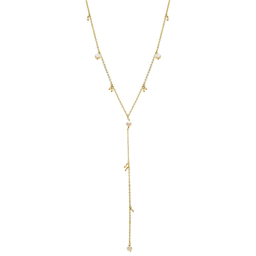 The Adina Eden Dangling Pearl Lariat Necklace is a sophisticated and elegant piece, crafted from brass and plated in luxurious 14K gold. This lariat-style necklace features beautiful faux pearls that dangle gracefully from a 6" drop, adding a touch of timeless charm and allure. With a 17" length and a 2" extender, it offers a customizable fit, perfect for layering or wearing alone as a statement piece. This necklace combines modern style with classic elegance, making it a standout addition to any jewelry collection.