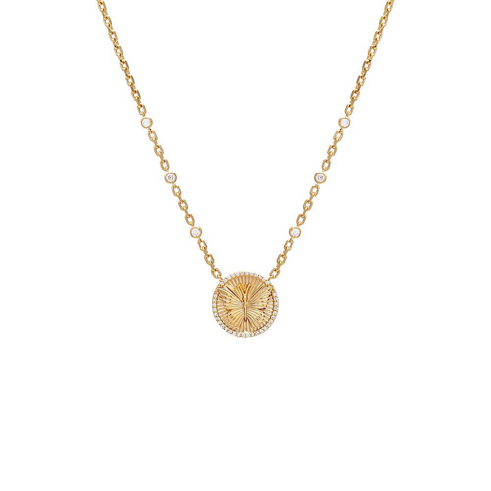 Evoke a whimsical vibe that dazzles anywhere and everywhere in Adina Eden's Diamond Butterfly Ridged Coin Necklace, featuring a ridged coin pendant adorned with a cute butterfly etching and outlined in brilliant diamonds. Expertly crafted in glowing 14K gold, this beauty dresses up your everyday 14K stack instantly. Flaunt it with a couple of chokers to complete the look.
