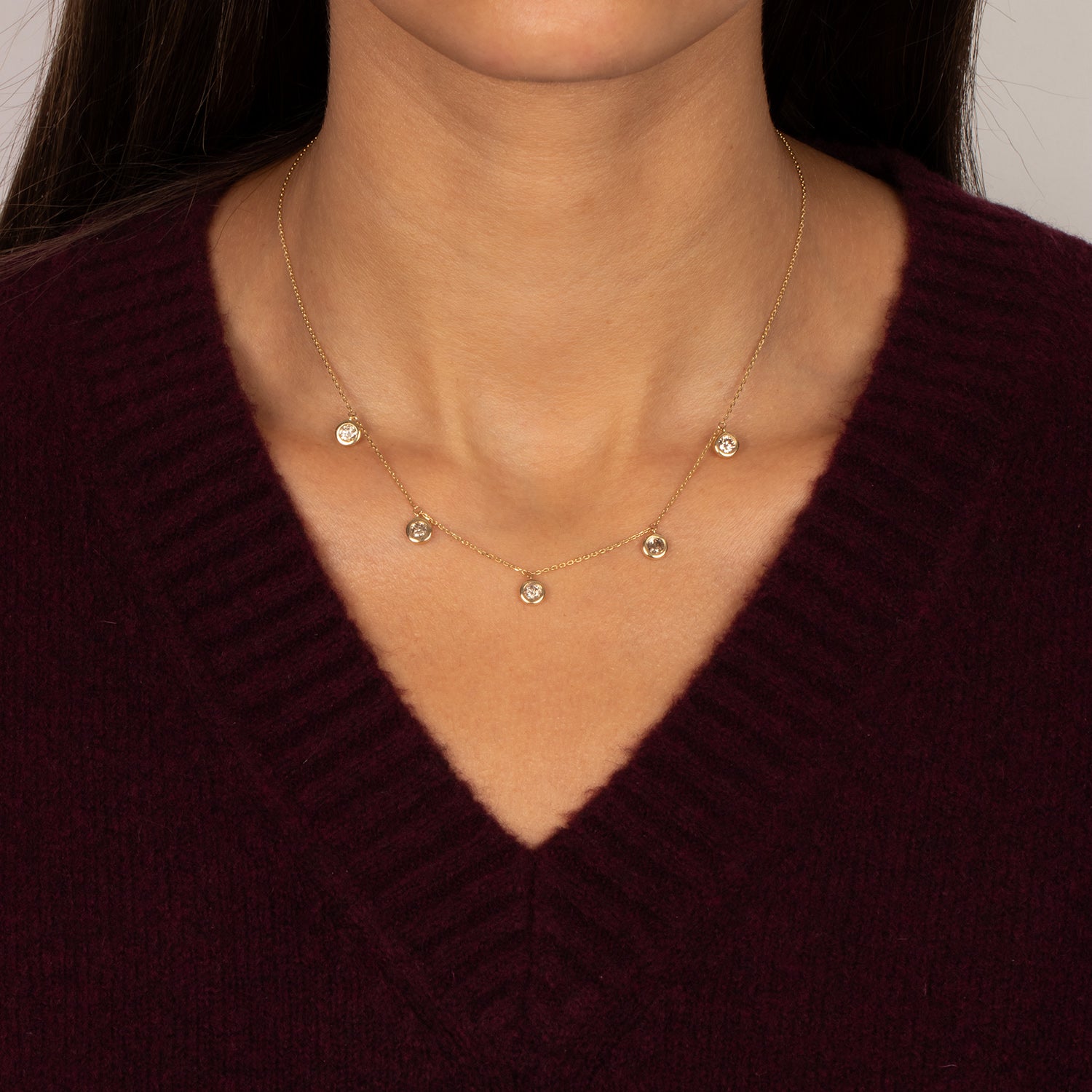 Add a sparkling splash to your daily look with Adina Eden's Diamond Dangling Bezel Necklace! This piece flaunts an array of bezel diamond charms that subtly swing from a delicate 14K gold chain. Feel glitzy-glam and rock it with a few 14K chains and a silky blouse for a timeless, always sophisticated vibe.