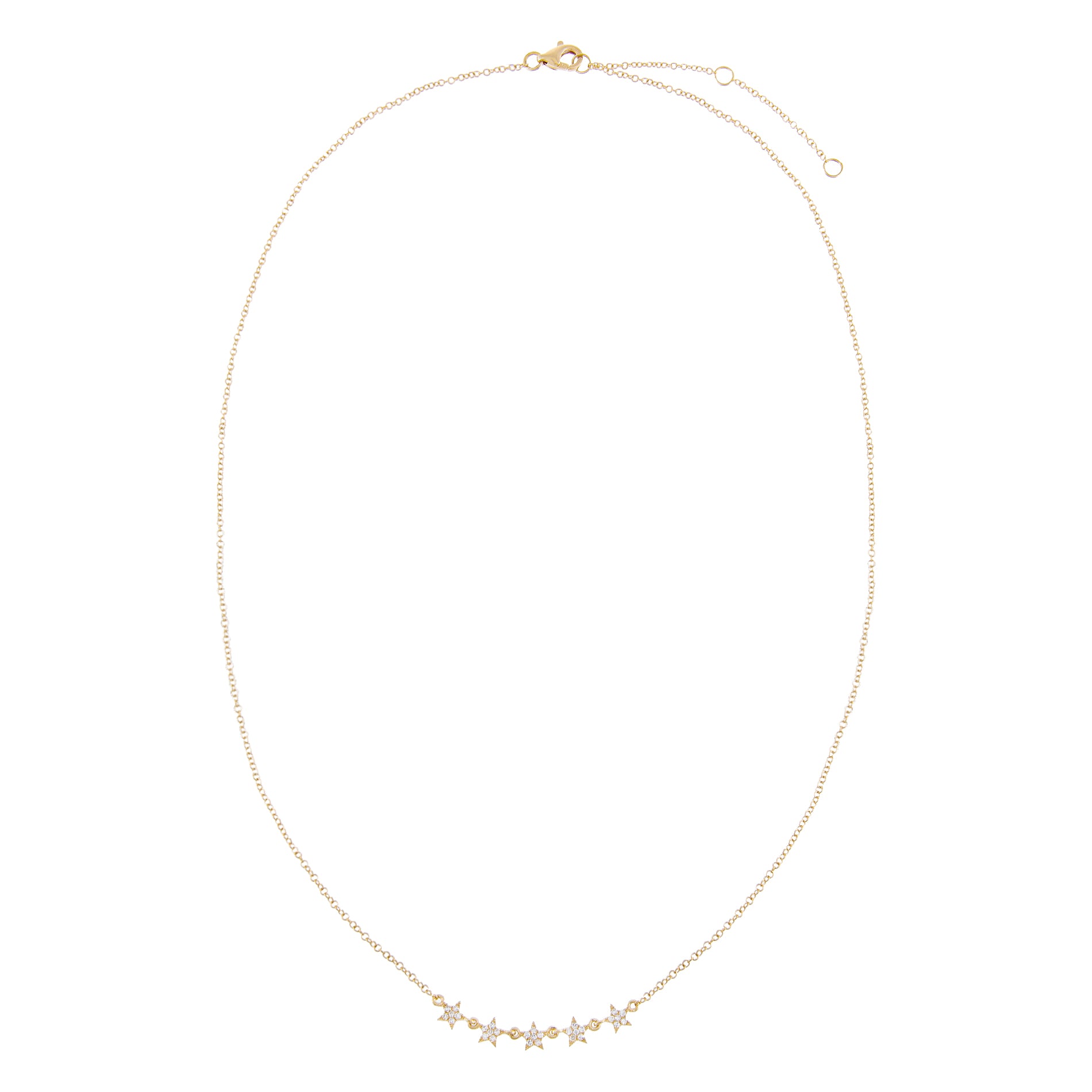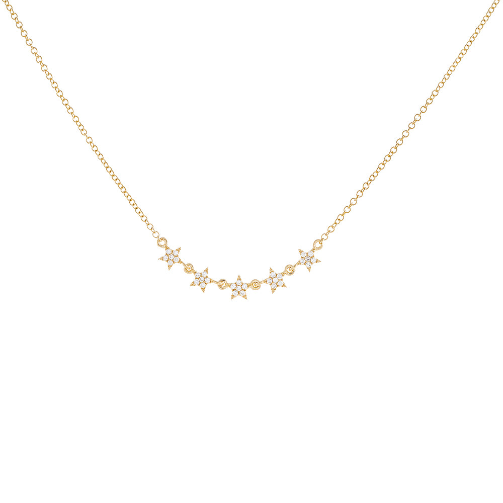 Create a style that shines and shimmers like the skies above with Adina Eden's Diamond Mini Stars Necklace, featuring a row of elegant miniature star pendants that are adorned with glistening diamonds and hang in a dainty row on a chic 14K gold chain. Pair this gem with a few fine necklaces and a t-shirt dress for a playful yet sophisticated look.