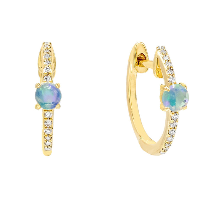 Create a whimsical vibe in Adina Eden's gorgeous huggie earrings, crafted with two iridescent opals and 26 pavé diamonds. Set in 14K gold, these fine earrings will give you a lifetime of shine. Style them with a pastel dress and heels for a dreamy and feminine effect.