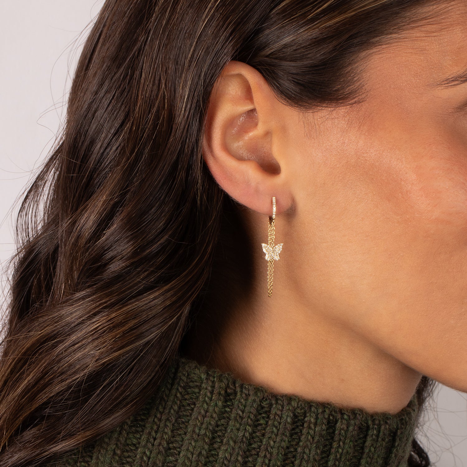 Introducing the Diamond Pavé Butterfly Chain Drop Huggie Earrings, a sophisticated and eye-catching choice crafted from luxurious 14K gold. These earrings feature a delicate butterfly motif adorned with pavé-set diamonds, offering brilliance and elegance. Each butterfly measures 8 MM in size and is embellished with high-quality diamonds totaling 0.17 carats. The huggie hoops have a diameter of 12 MM, ensuring a secure and comfortable fit. The earrings are complemented by drop chains: a short chain measuring 0.5 inches and a longer chain measuring 0.85 inches. Sold as a pair, these earrings offer versatility in styling, allowing you to wear them as a coordinated set. With diamond color ranging from H-I and clarity of I-1, the Diamond Pavé Butterfly Chain Drop Huggie Earrings combine exquisite craftsmanship with timeless design, making them ideal for adding a touch of sparkle to any occasion.