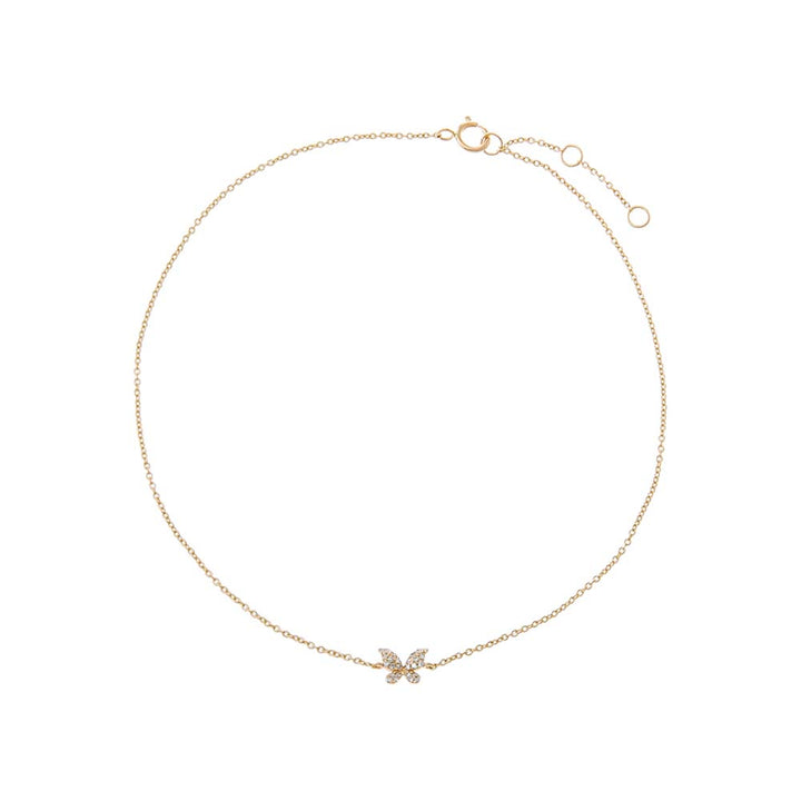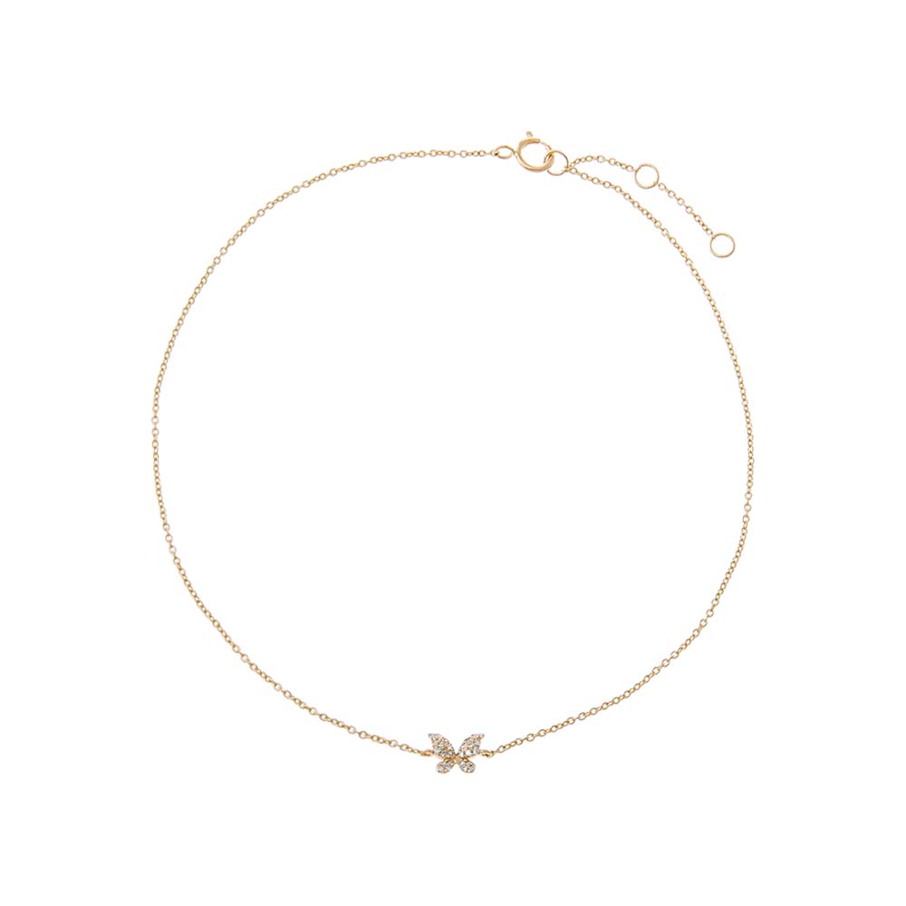 Embrace delicate beauty with the Adina Eden Diamond Pave Butterfly Pendant Anklet, exquisitely crafted in 14K gold. This enchanting anklet features a charming butterfly pendant, adorned with 26 brilliant round-cut natural diamonds totaling .05 carats. The butterfly, measuring 5MM X 7MM, sparkles with elegance and adds a whimsical touch to your look. With an adjustable length of 9" plus two 0.5" extenders, this anklet offers a perfect and comfortable fit. Each piece is custom-made with meticulous attention to detail, requiring 12-18 business days for production. Add a touch of grace and sparkle to your jewelry collection with this stunning butterfly anklet from Adina Eden.