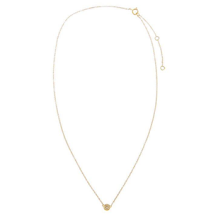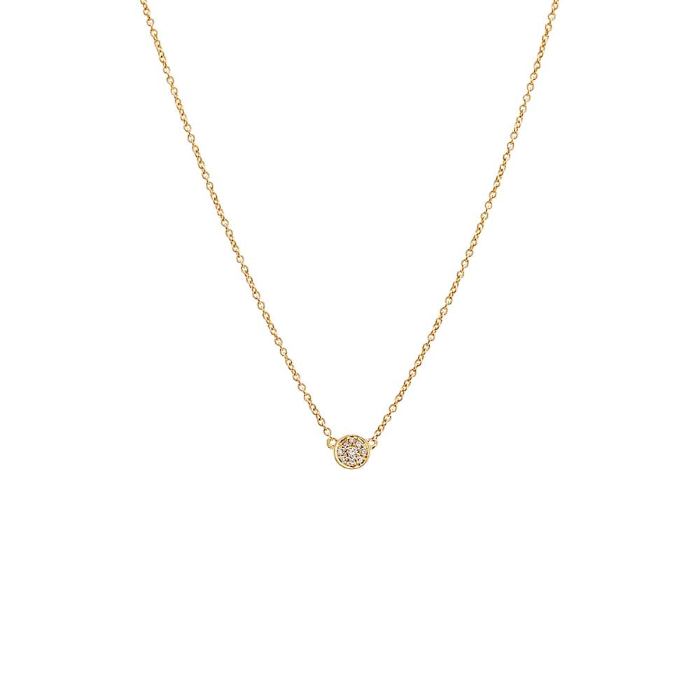 Illuminate your style with the Diamond Pave Mini Disc Necklace, a delicate yet dazzling piece crafted in 14K gold. This necklace features a 6 MM mini disc pendant adorned with 9 round brilliant-cut natural diamonds, totaling 0.05 carats, arranged in a pave setting for a brilliant sparkle. With a total weight of 0.41 grams, this lightweight necklace offers a refined touch of elegance. Adjustable from 15" to 17" with the extender, it ensures a perfect fit for any neckline, making it a versatile addition to your jewelry collection