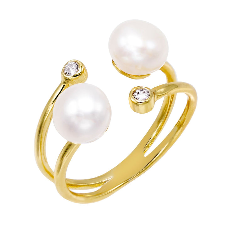 Topped with two shiny faux pearls and dainty CZ stones, Adina Eden's pearl ring is designed to make you sparkle. This unique ring is great for everyday wear and will look especially chic stacked with basic gold bands.