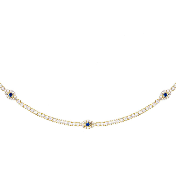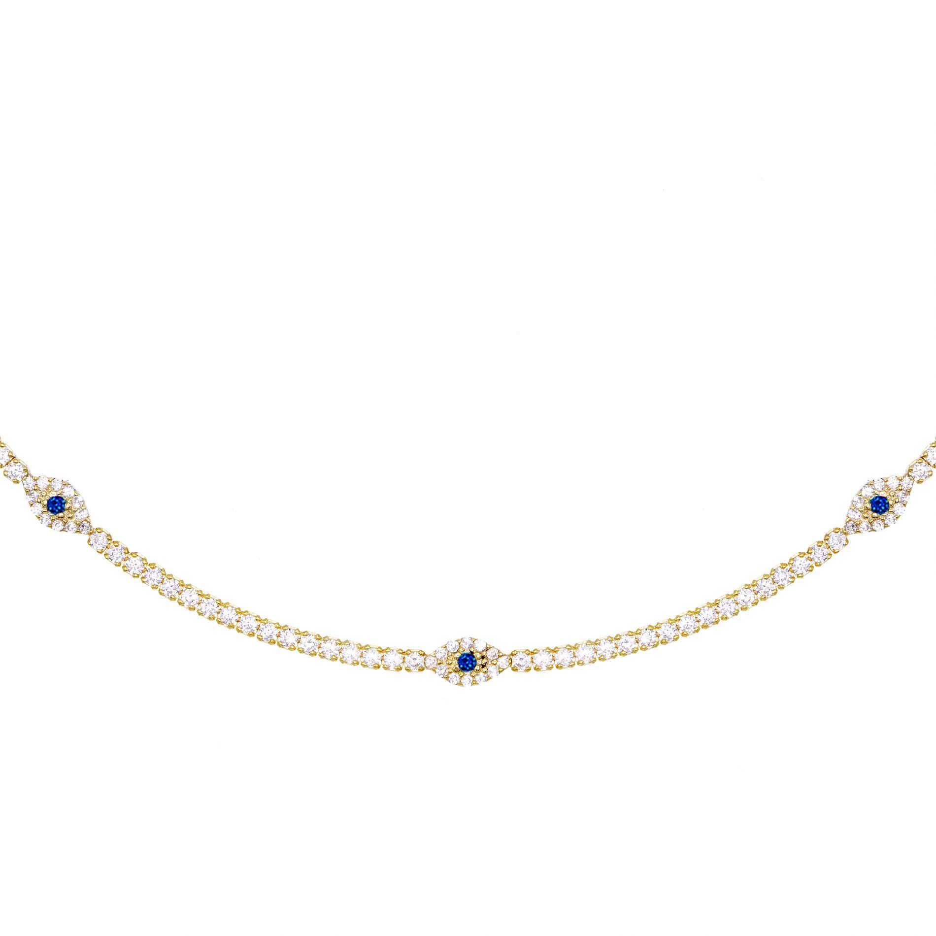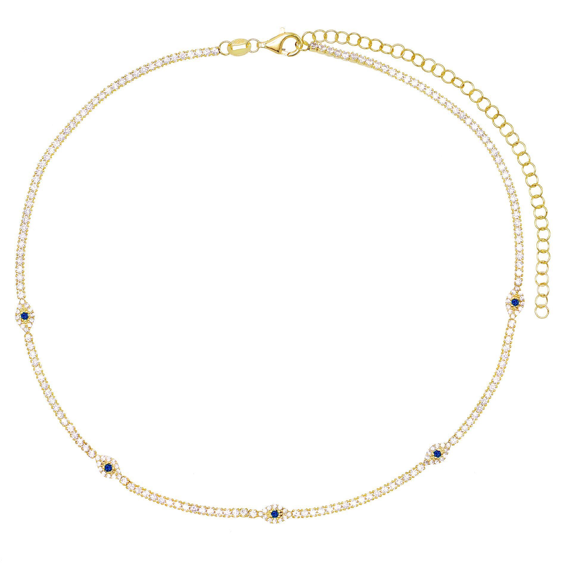 Beautify your neck with Adina Eden's 'Evil Eye' choker, crafted with eye accents with blue crystals for the eyeballs. This choker necklace is set in gold vermeil and surrounded by white stones in the classic tennis style. Pair it with your denim for a charming weekend look.