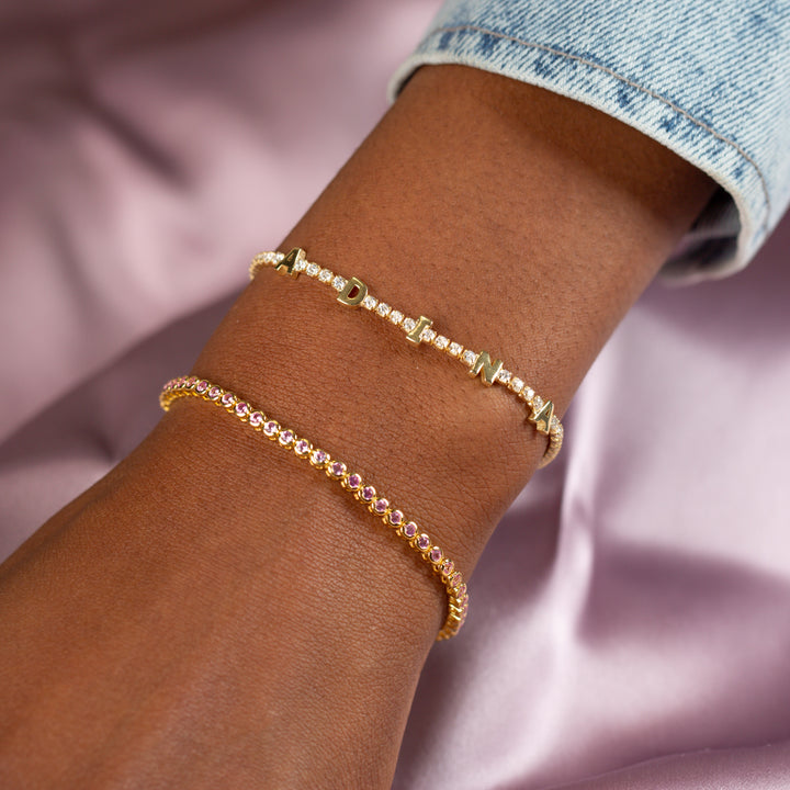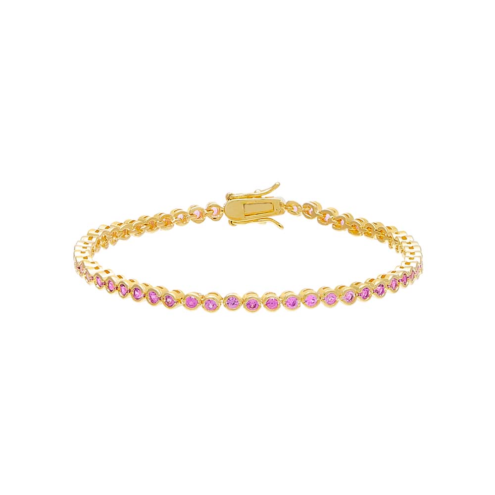 Rock a colorful minimalist staple in Adina Eden's Bezel Tennis Bracelet, featuring a brightly colored bezel-cut CZ stone tennis chain design in gold-plating. Rock this gem in a series of vibrant colors ranging from sapphire pink to emerald green. Crafted with that timeless tennis design in mind, this piece makes the perfect base to stack up with some charms and chains.