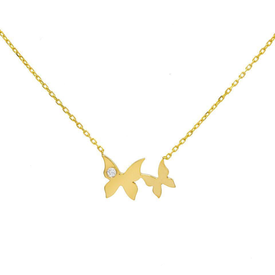 Take flight in Adina Eden's 'Heidi' pendant necklace, designed with two adorable butterfly charms. It's crafted in 14K gold with a dainty chain and a single diamond on one charm. This pretty necklace will earn you compliments.