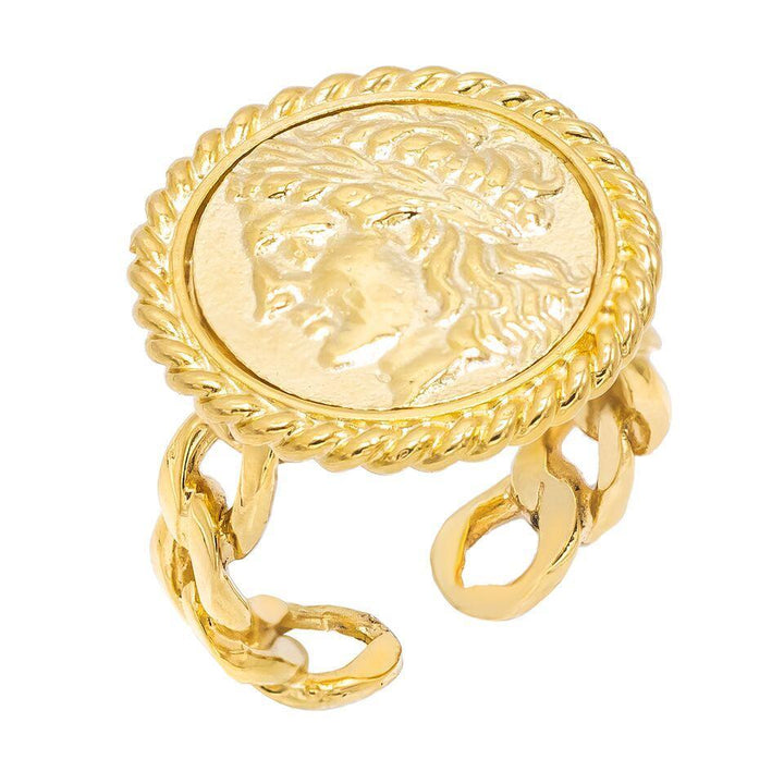 An intricate coin tops an adjustable chain band on Adina Eden's coin ring. Pair this vintage-inspired ring with a breezy dress and you will look like a Greek goddess.