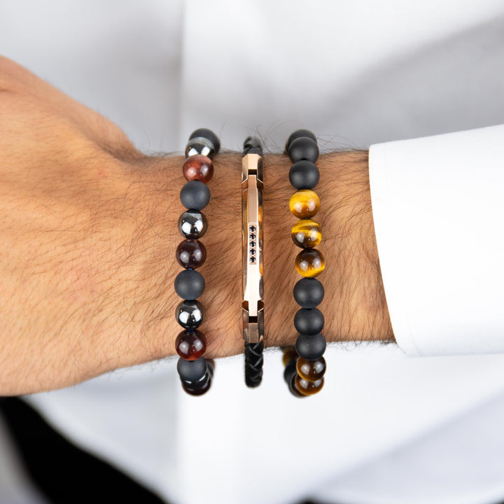 Amplify your look with Adina Eden's braided leather bracelet, crafted with black leather and stainless steel accents in rose gold and black. This sleek, yet unique bracelet will pair perfectly with your everyday style.