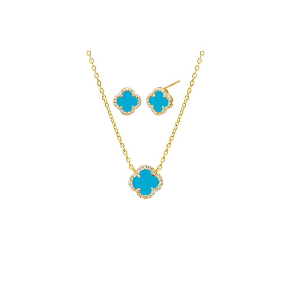 Mini Pave Colored Stone Clover Necklace & Earring Combo Set