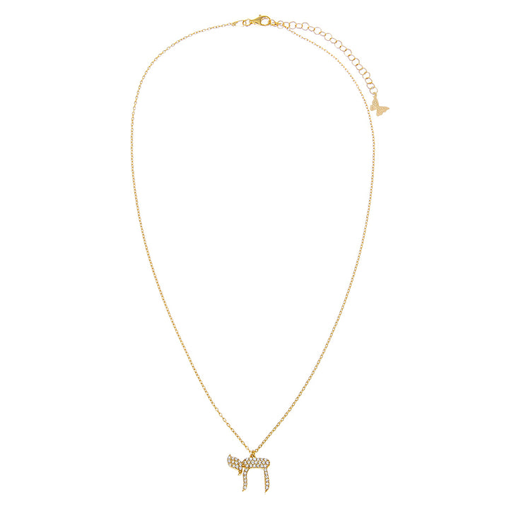 Celebrate tradition with a touch of elegance in Adina Eden’s pave chai pendant necklace. Crafted from sterling silver with a luxurious 14K gold plating, this meaningful piece features a 14mm Chai pendant, symbolizing life and good fortune. Adorned with shimmering clear CZ stones, it radiates timeless sophistication. Suspended from a delicate 16-inch chain with a 2-inch extender, this necklace offers a versatile and comfortable fit. Whether worn alone or layered, it’s a beautiful expression of faith and style.