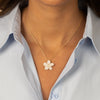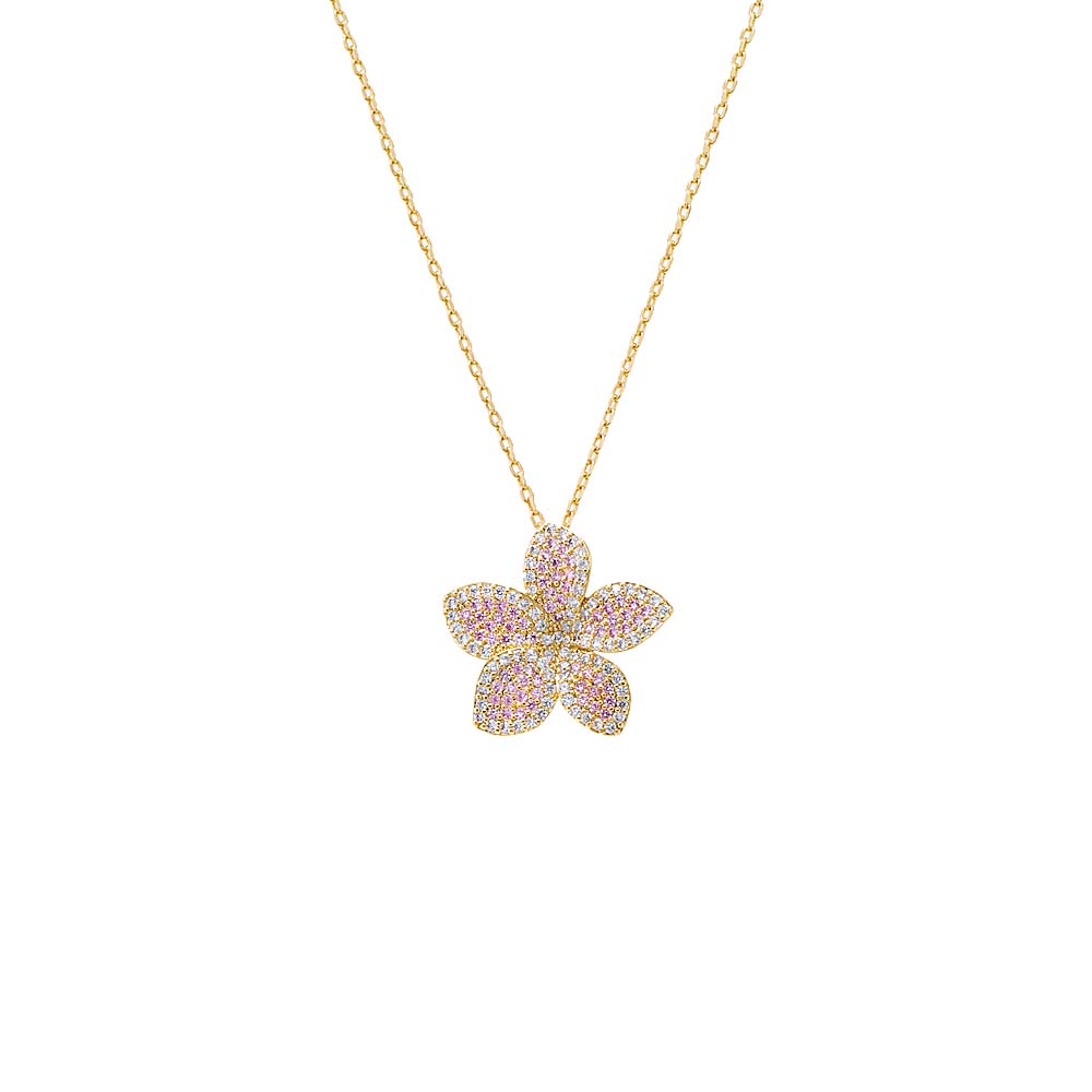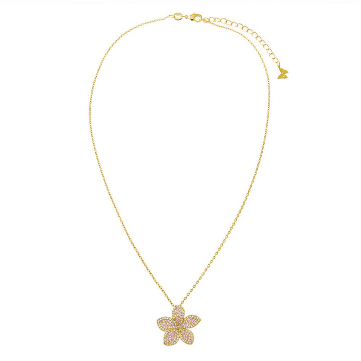 The Adina Eden Pave Colored Flower Fancy Pendant Necklace is a vibrant and elegant piece, crafted from durable brass and plated in 14K gold. This necklace features a beautiful 19mm flower pendant adorned with pave-set colored stones, adding a pop of color and sparkle. With a length of 16" plus a 2" extender, it offers a customizable fit, making it perfect for layering or wearing alone as a bold statement piece. This necklace brings a touch of floral charm and sophistication, making it a standout addition to any jewelry collection.