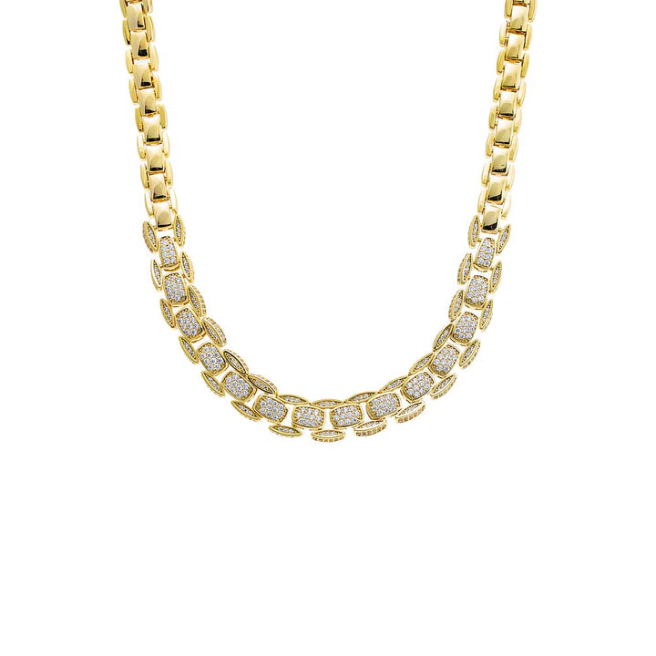 Introducing the Pave Super Chunky Box Chain Necklace, a bold and luxurious statement piece crafted from high-quality brass and plated with 14K gold. This necklace features a super chunky box chain design, with a thickness of 10MM, adorned with sparkling clear CZ stones that add a touch of glamour and sophistication. The necklace measures 16.5 inches in length, ensuring it sits perfectly on the neckline. It is secured with a sturdy box clasp, providing both style and functionality. Perfect for making a statement at special occasions or elevating your everyday look, the Pave Super Chunky Box Chain Necklace combines contemporary style with timeless elegance, making it a standout addition to your jewelry collection.