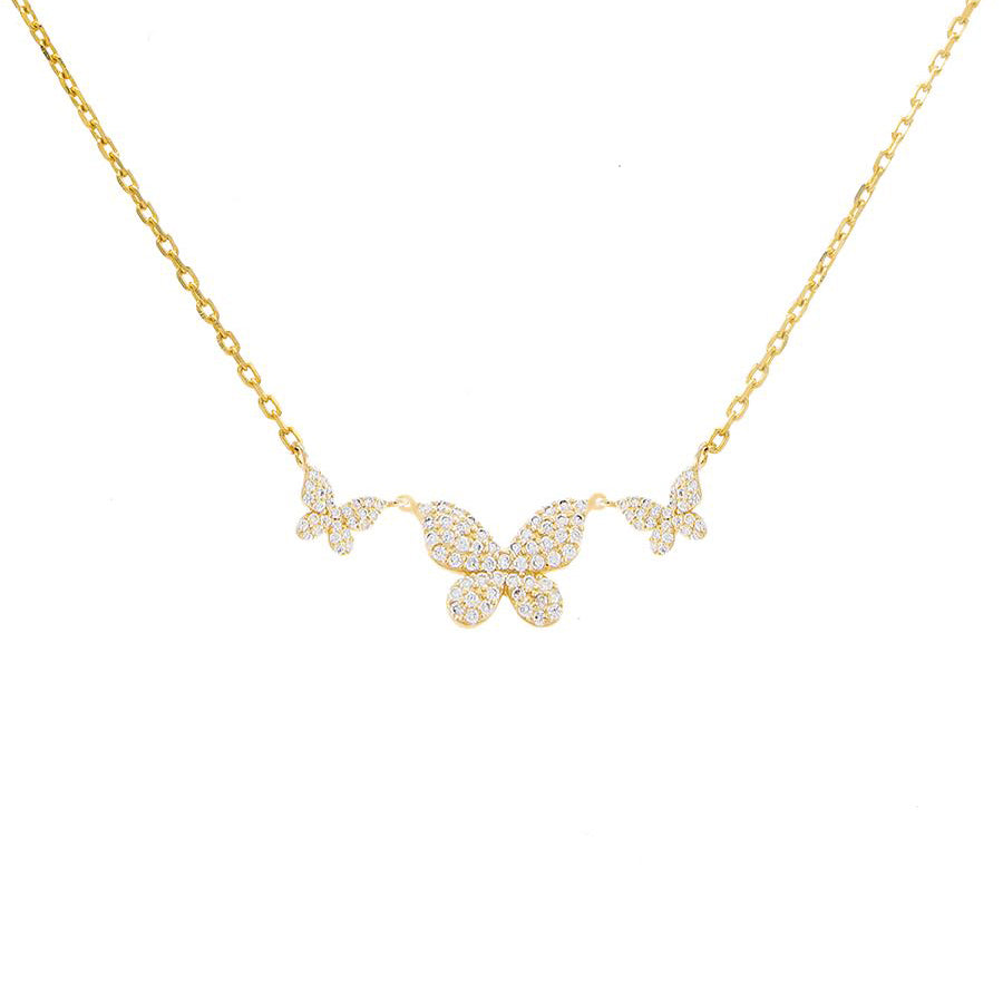 Create a charming look that dazzles in Adina Eden's Pavé Triple Butterfly Necklace, featuring a sweet trio of large and small CZ-stone adorned butterfly pendants set on a dainty gold vermeil chain. Rock a look that is dreamy yet versatile, all in one design, particularly when you pair this gem with a couple of other pendant necklaces for a cute view that's perfect for a day out with friends.