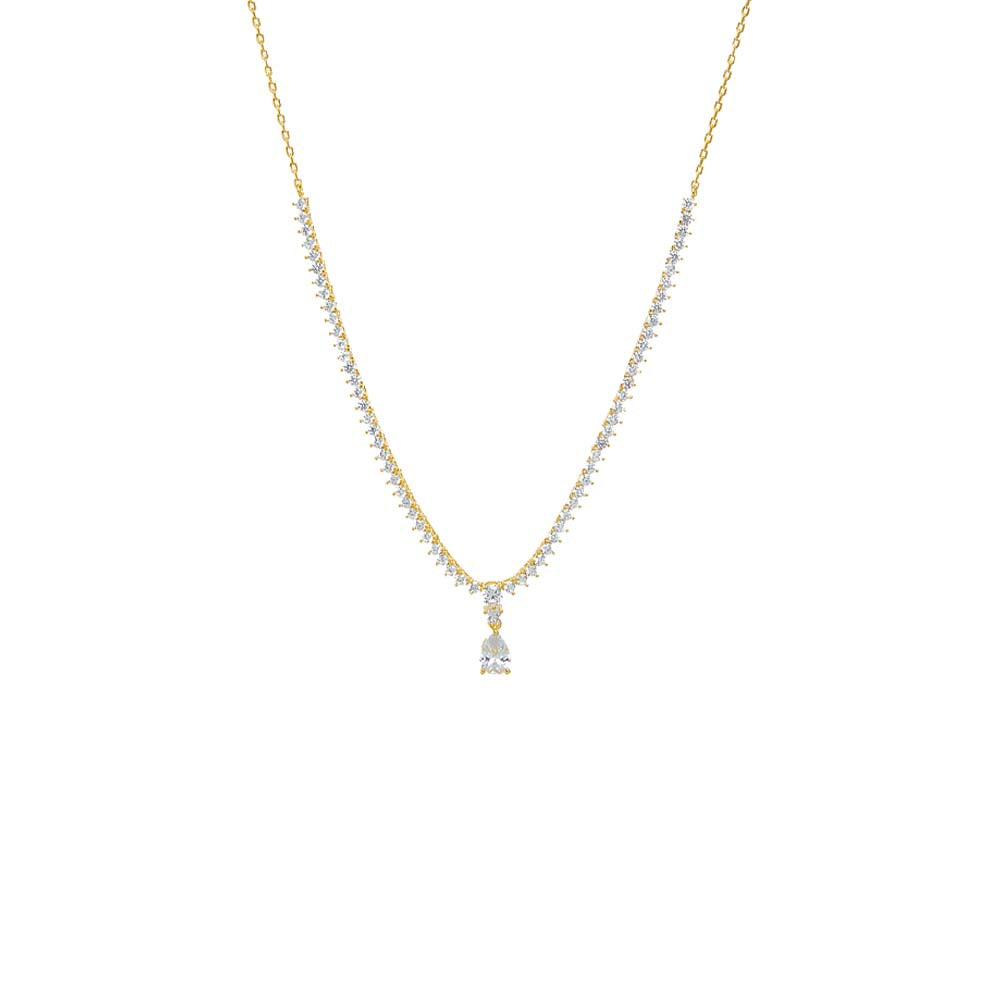 With a flawless silhouette, the Pear Drop Half Tennis Chain Necklace by Adina Eden is the Necklace you'll never want to take off. This stunning cute necklace for women features a bold silhouette and intricate detailing, available in Gold and Silver for endless styling possibilities. Every day is different—this piece lets you show up feeling confident and completely put together. Style this gold plated necklace with styles from the Chain Necklaces collection to make your everyday styling effortless. Once you try it, you'll keep styling it again without hesitation.