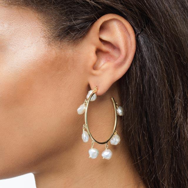 Seven baroque freshwater pearls dangle from each of Adina Eden's large hoop earrings. Rock these pretty earrings with a simple long dress for a glamorous, beach-inspired look.