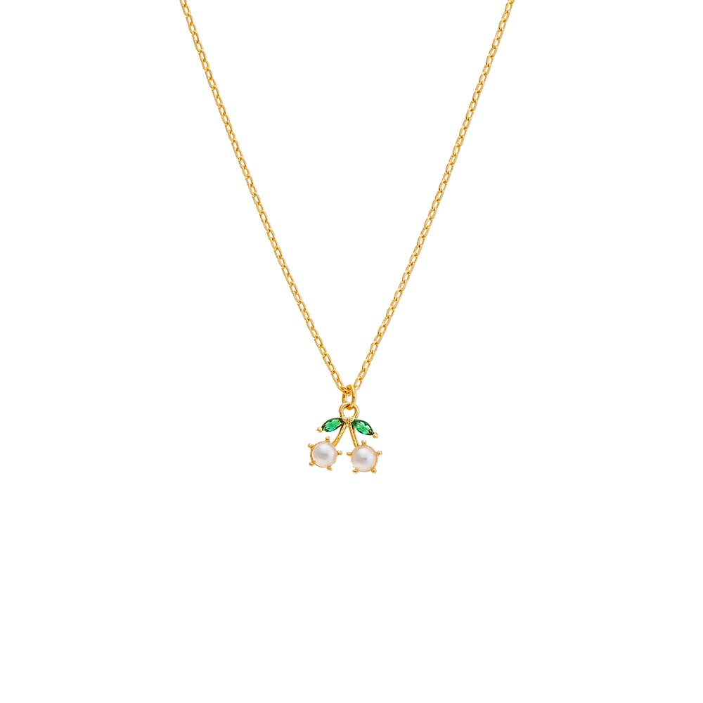 Discover whimsical elegance with the Pearl & Emerald Cherry Pendant Necklace from Adina Eden. Crafted from brass and plated with 14K gold, this necklace features faux white pearls and emerald green CZ stones adorning a charming cherry pendant. The cherry measures 9MM, adding a delightful touch of color and sparkle to any neckline. With a length of 16" and a 2" extender, it offers versatility in styling. Perfect for adding a playful yet sophisticated accent to your look, this necklace is ideal for both everyday wear and special occasions. Elevate your style with the enchanting Pearl & Emerald Cherry Pendant Necklace from Adina Eden.