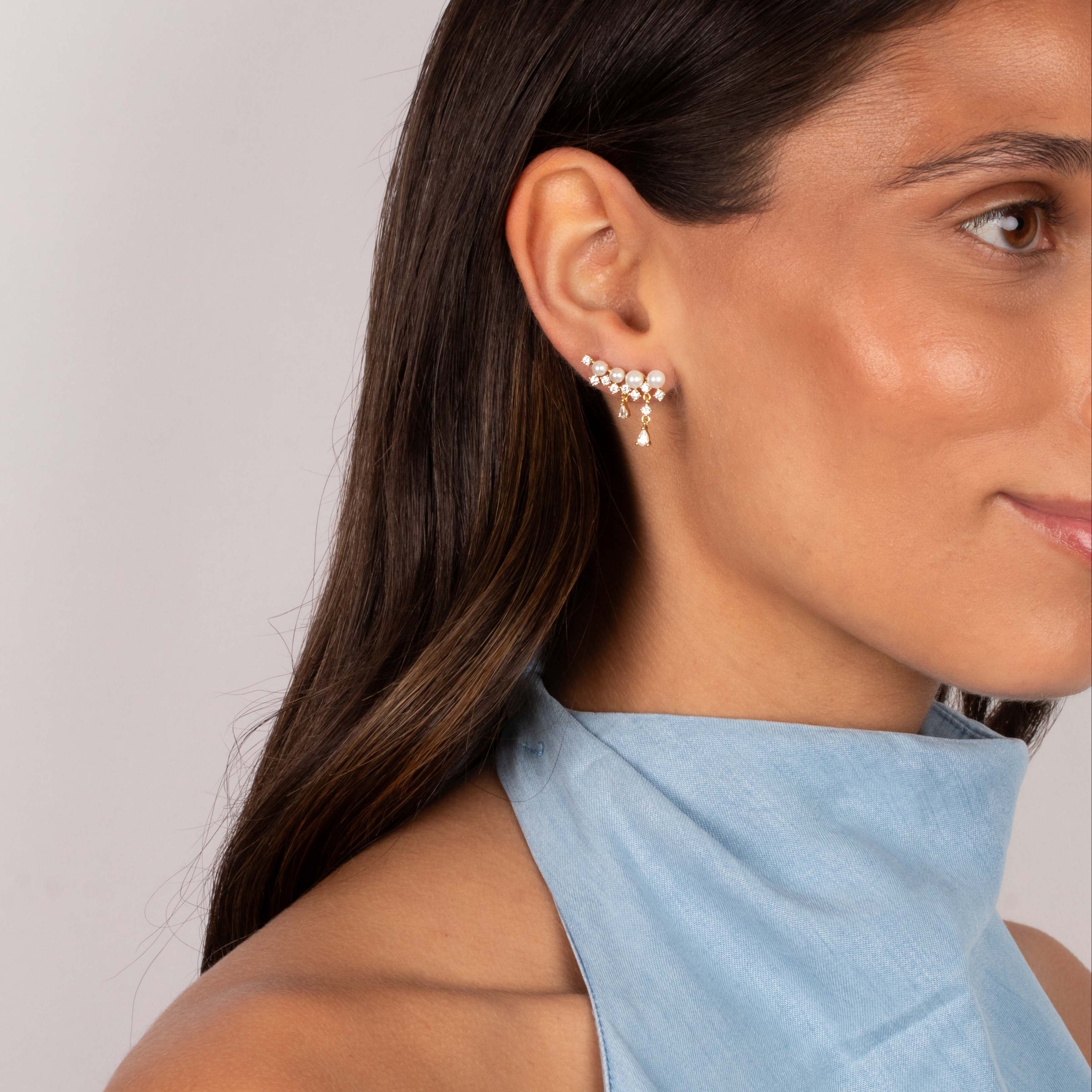 Pearl X CZ Curved Bar Dangling Stud Earring