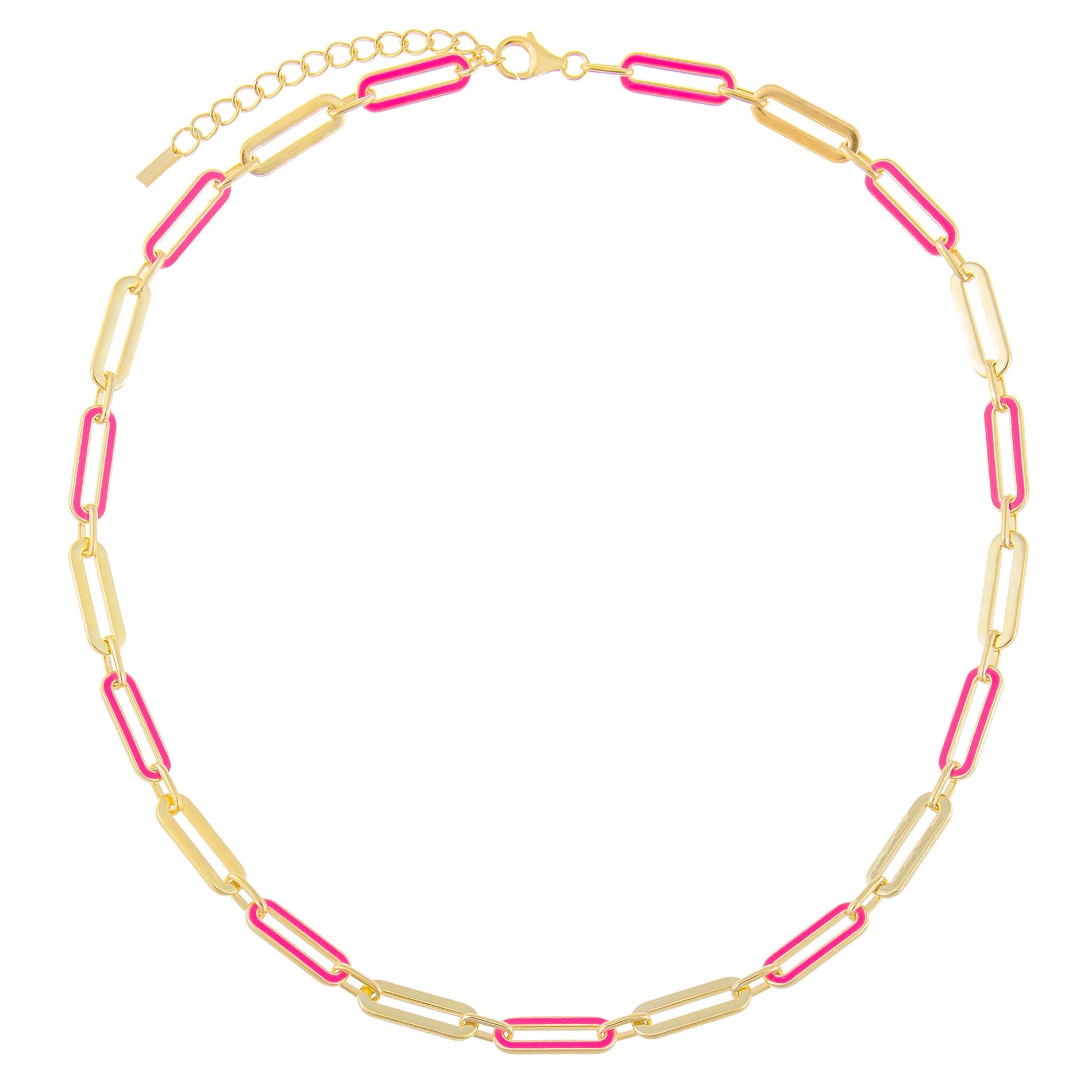 Rock a true classic with a modern pop of color in Adina Eden's Pink Enamel Oval Link Necklace, featuring a cute, alternating pattern of gold-plating and sapphire pink or neon pink enamel links. The design is the definition of "subtle chic." Wear this gem with another chain or two or with an alluring lariat. Either way, you'll shine bright wherever you go.