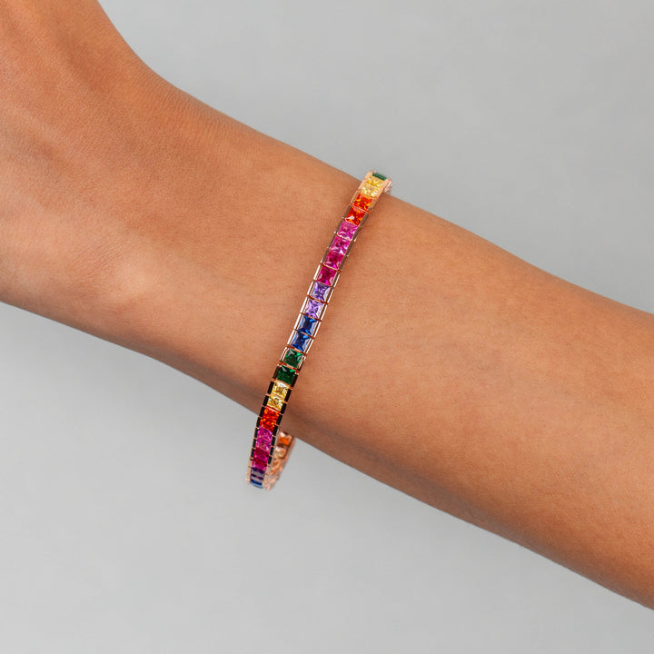 Make a truly royal statement in rainbow with Adina Eden's Rainbow Princess Cut Tennis Bracelet, featuring a stunning array of princess-cut, multi-colored CZ stones set into a delicate tennis chain. This beauty simply dazzles. Wear it with your favorite chain stack or a classic tennis bracelet to turn all heads your way.