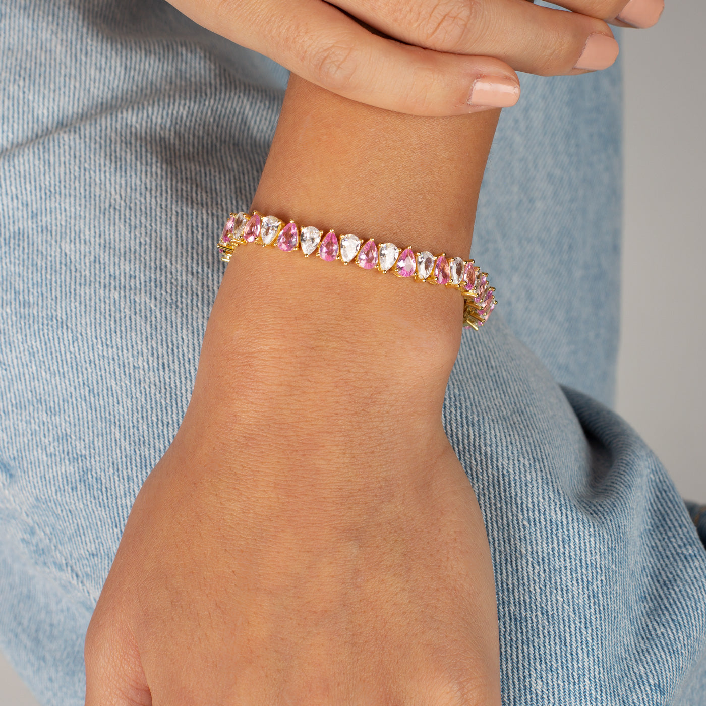 Make heads turn instantly in Adina Eden's Colored Wide Pear Shaped Tennis Bracelet, featuring an alternating series of colored and clear, pear-cut CZs set into a classic tennis chain. Wear it in various colors from emerald green to vibrant turquoise. With its glittering design, this gem is meant to be the centerpiece in your evening chain and charm look