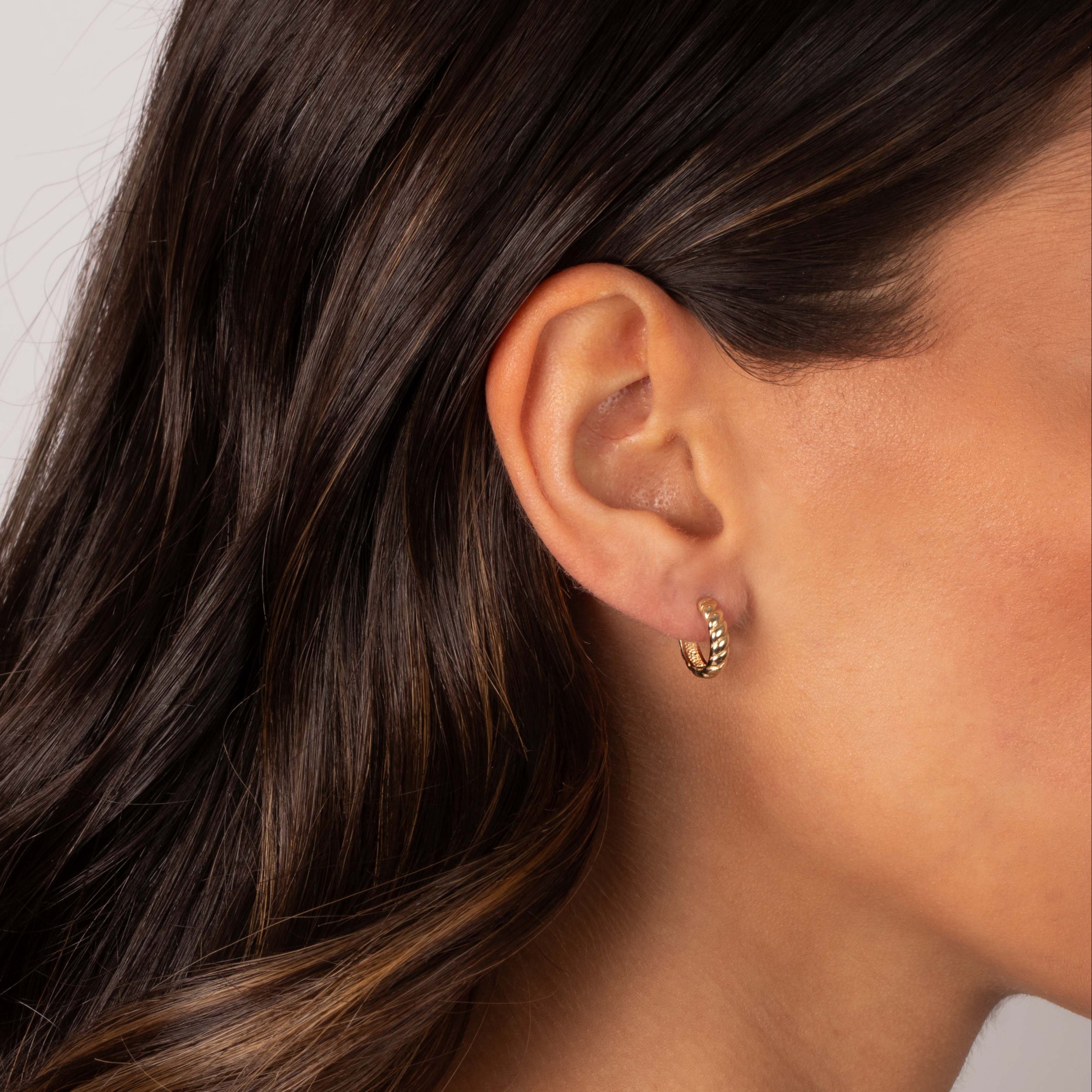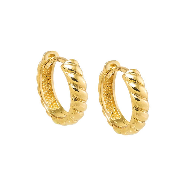 The Solid Flowy Ridged Huggie Earring from Adina Eden is made from 14K gold, featuring a flowy, ridged texture for a unique and elegant design. With a width of 3 mm and a huggie size of 13 mm, these earrings offer a chic, polished look, secured with a click-down hinge closure.